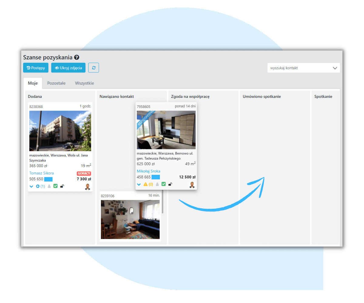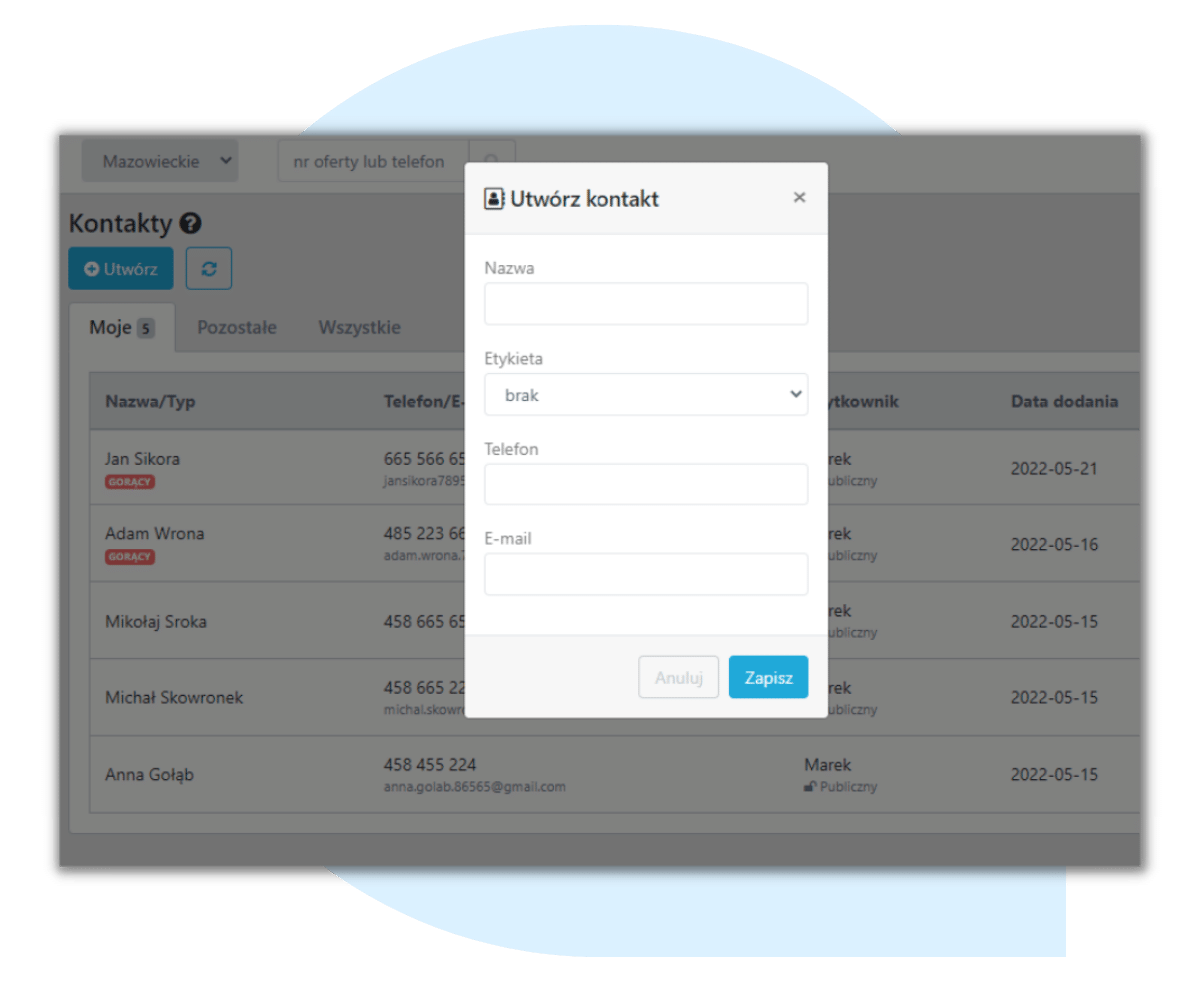 Możesz tworzyć i edytować kontakty dla klientów oferujących i poszukujących. Masz możliwość przypisywania klientom etykiet, dzięki którym rozpoznasz osoby bardziej lub mniej zainteresowane współpracą.