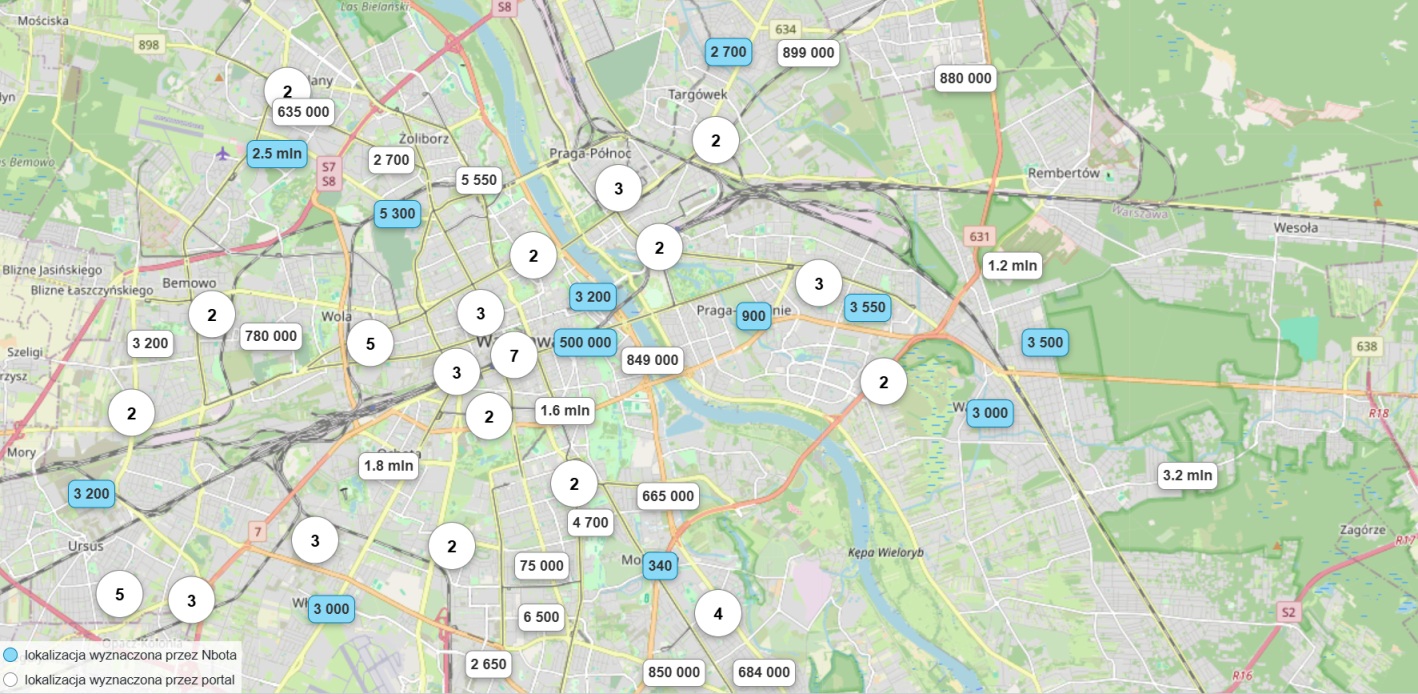 Oferty, których współrzędne zostały przez nas poprawione, są oznaczone na mapie kolorem niebieskim.